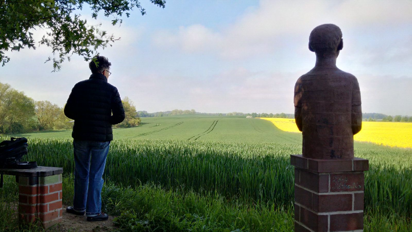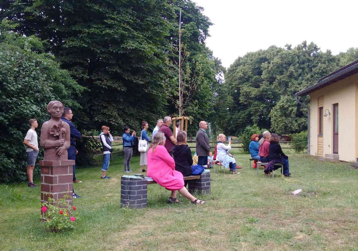 Sa 3. Juli 11 Uhr Alt Bukow an der Skulptur Frau mit Blume gegenüber der Kirche