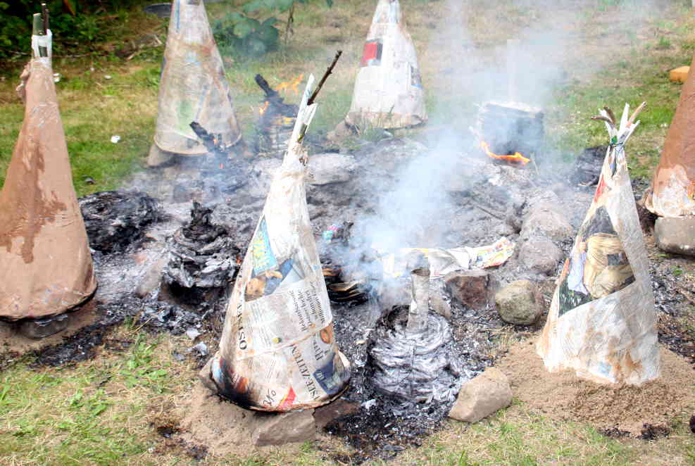 Bevor es jedoch damit losgeht, treffen wir uns ein paar Tage vorher, um kleinformatige Tierfiguren, Schmuck (Perlen) oder Gefäße zum Brennen herzustellen. Wir brauchen dazu neben schönem Wetter jede Menge Zeitungen, Arbeitskleidung, einen Campingstuhl und vielleicht etwas zum Grillen. Ton und Werkzeug bringe ich mit. Die Keramik sollte recht robust, aber nicht zu dick und nicht zu filigran sein, damit sie den turbulenten Brennprozess möglichst gut übersteht. Wir bauen die Öfen quasi um die gut getrockneten Stücke herum. Wenn dann die Öfen angezündet werden, dauert es ein paar Stunden bis sie durchgebrannt sind. Das Ergebnis ist eine urtümliche Keramik, die das Flammenspiel des Feuers erkennen läßt… wenn alles klappt. Vorkenntnisse sind nicht nötig. Mir kommt es auch weniger auf perfekte Ergebnisse an, als darauf, Spaß und Freude zu haben, am gemeinsamen Arbeiten draußen in der Natur.“