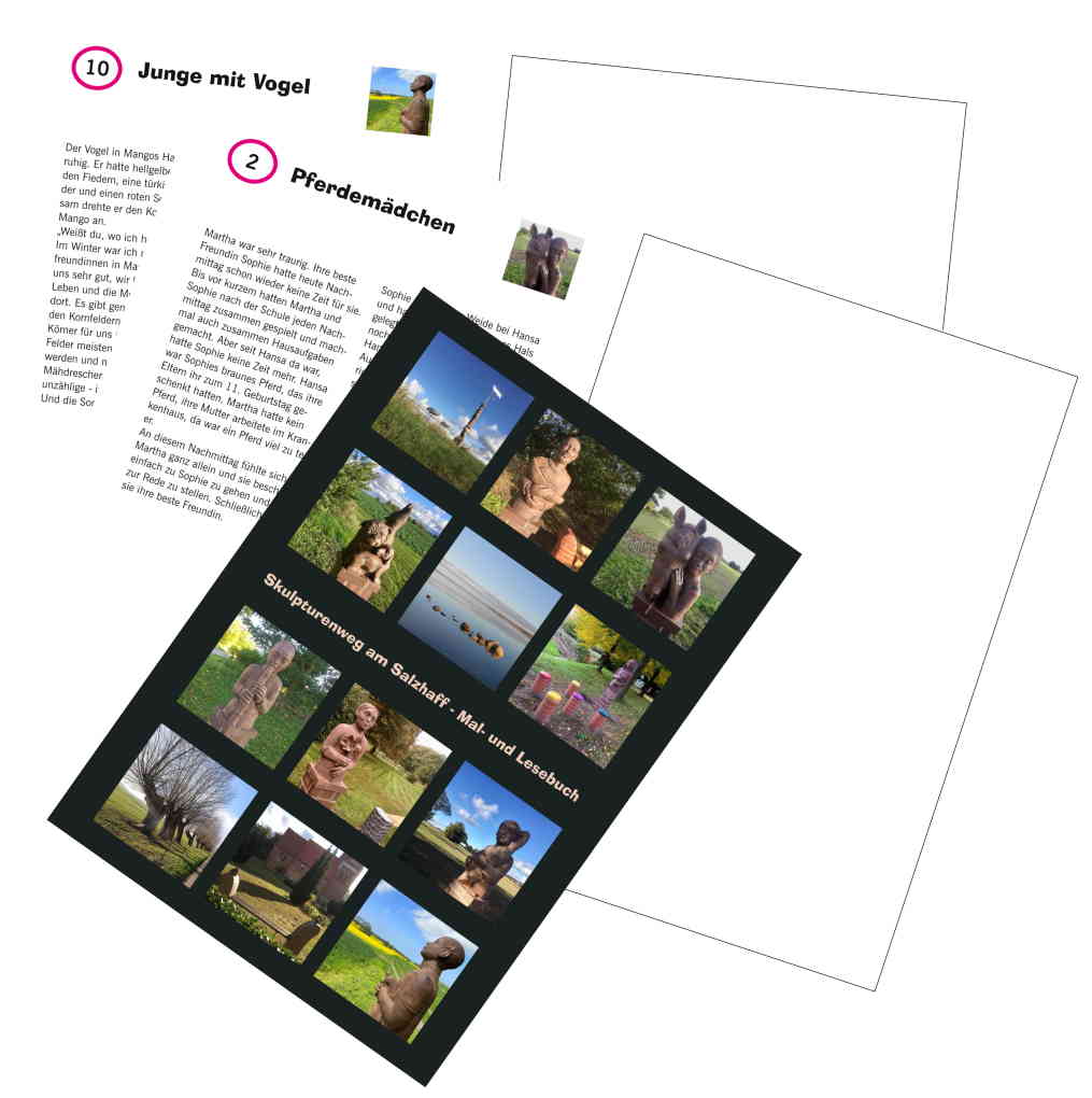 Für individuelle Kreativität hat der Verein ein Mal- und Lesebuch herausgegeben, in dem zu jeder Skulptur eine Geschichte erzählt wird und jeweils eine leere Heftseite dazu einlädt, selbst eine Geschichte zu erfinden oder ein Bild zur Skulpturenstation oder zur Landschaft zu zeichnen. Das Mal- und Lesebuch eignet sich auch besonders gut für Familienspaziergänge mit Kindern. In der Heftmitte finden Sie einen Lageplan des Skulpturenwegs.